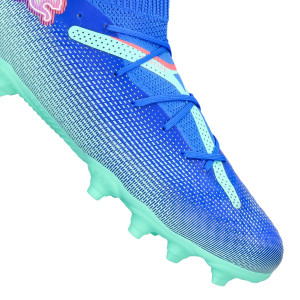 Scarpe da calcio per bambini Puma Future 7 Pro FG/AG. Sintetiche, da usare su campi in erba naturale e artificiale. Pensate per gli attaccanti e disponibili nella colorazione Bluemazing-White-Electric Peppermint.