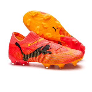 Scarpe da calcio per adulti Puma Future 7 Ultimate FG/AG. Scarpe in filato da usare su campi in erba naturale asciutta o bagnata e per campi in erba sintetica di ultima generazione. Scarpe d'alta gamma disponibili nella colorazione Sunset Glow-Black-Sun Stream.
