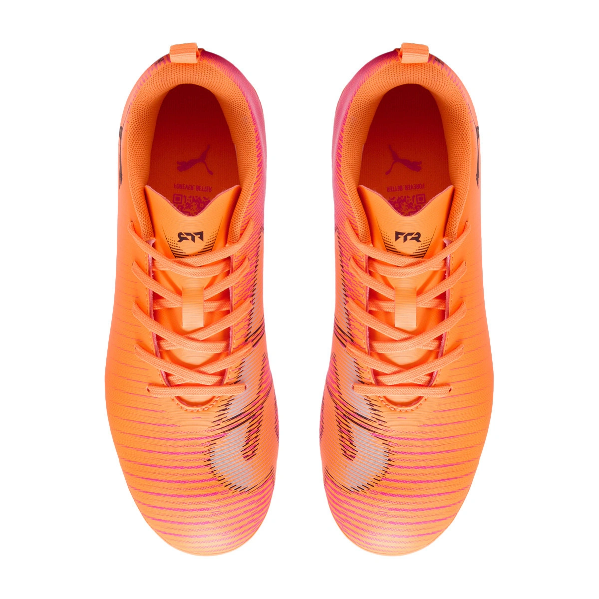Scarpe da calcio per bambini Future 8 Play FG/AG. Sintetiche, da usare su campi in erba artificiale e naturale. Di gamma bassa, disponibili nella colorazione Heat Fire-Black-Ravish.