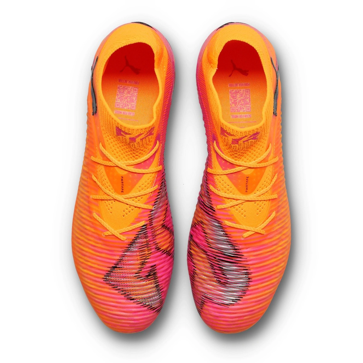 Scarpe da calcio per adulti Puma Future 8 Ultimate FG. In filato, da usare su campi in erba naturale. D'alta gamma e disponibili nella colorazione Heat Fire-Black-Ravish.