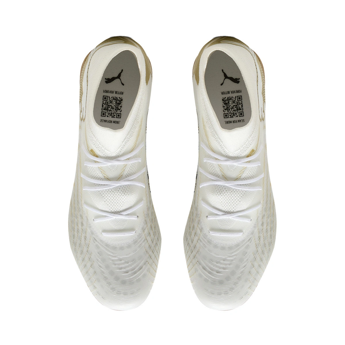 Scarpe da calcio per adulti Puma Future 9 Match FG/AG. Sintetiche, da usare su campi in erba naturale e artificiale. Di gamma base, disponibili nella colorazione White-Metallic Gold-Black.