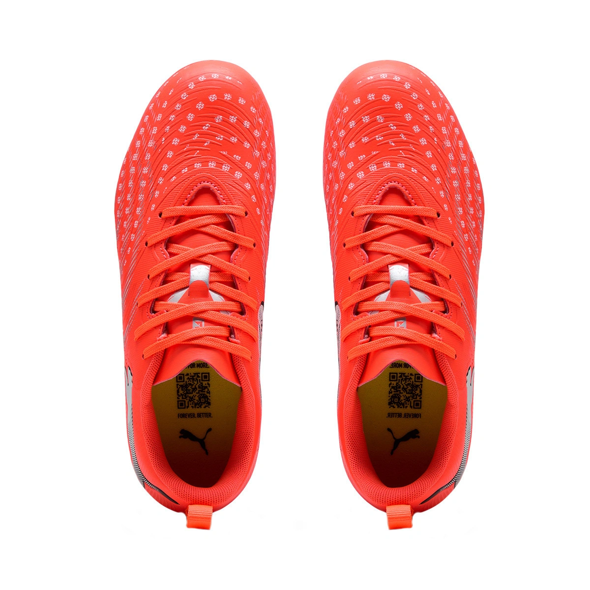 Scarpe da calcio per bambini Puma Future 9 Play FG/AG. Sintetiche, da usare sui campi in erba artificiale e naturale. Di gamma bassa e disponibili nella colorazione Puma Red-Puma White-Glowing Red-Puma Black.