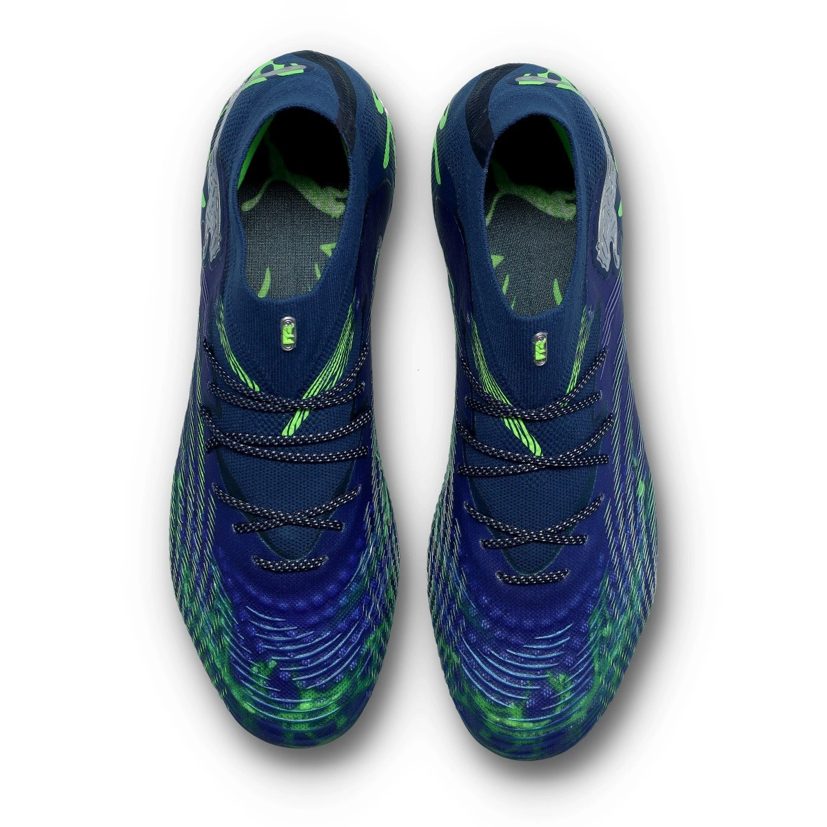 Scarpe da calcio Puma Future 9 Ultimate FG. In filato, da utilizzare su campi in erba naturale asciutta. D'alta gamma e disponibili nella colorazione Lapis Lazuli-Bright Aqua-Green Glare-Glowing.