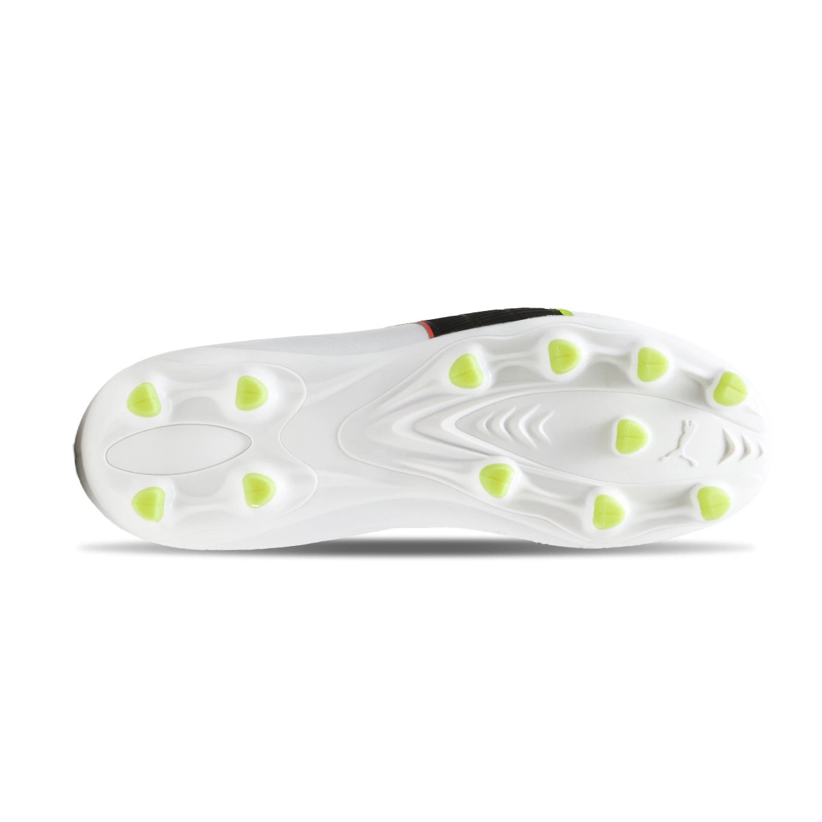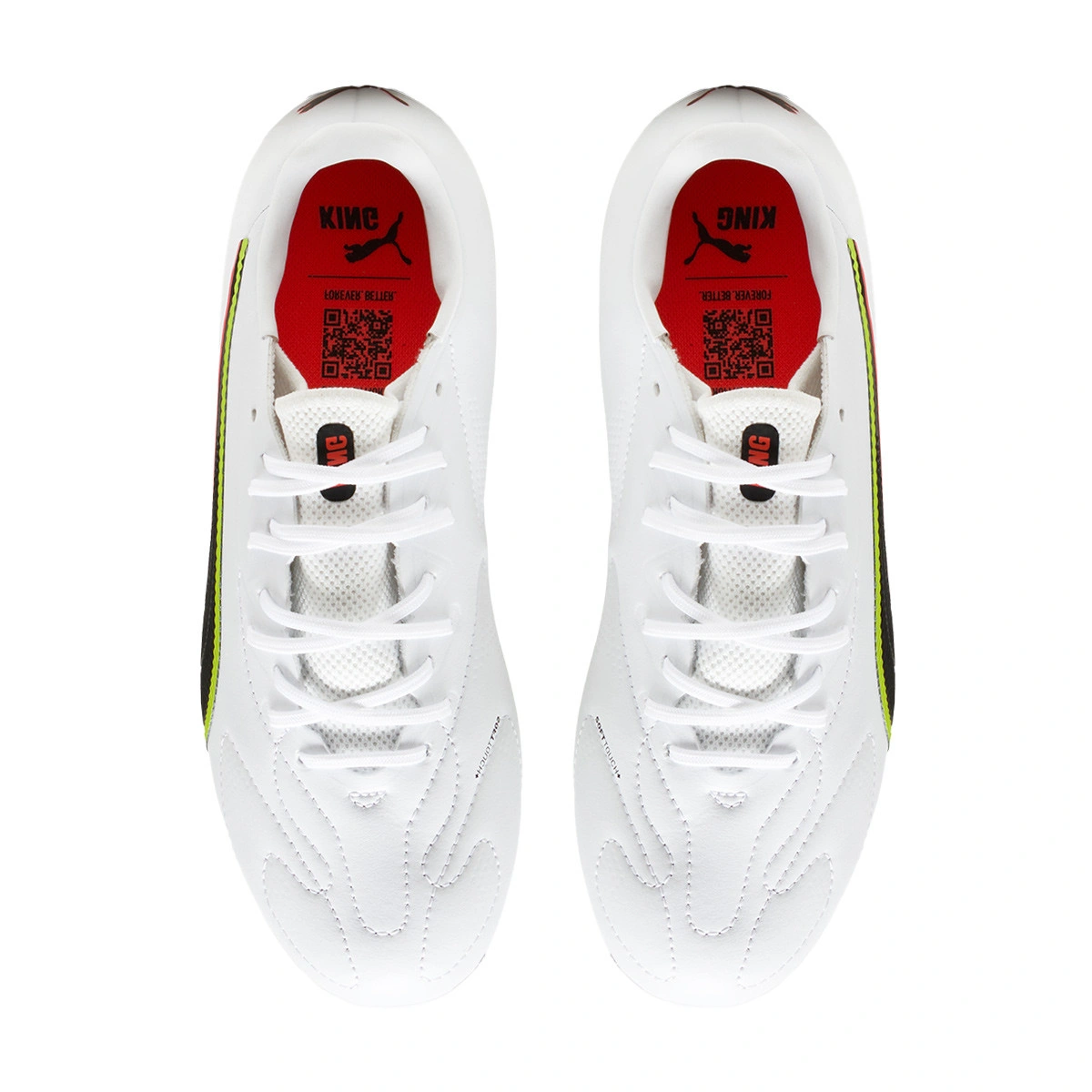 Scarpe da calcio per bambini Puma King Match FG/AG 20, da usare su campi in erba sintetica/moquette e naturale. Di gamma base e disponibili nella colorazione Puma White-Glowing Red-Yellow Alert.
