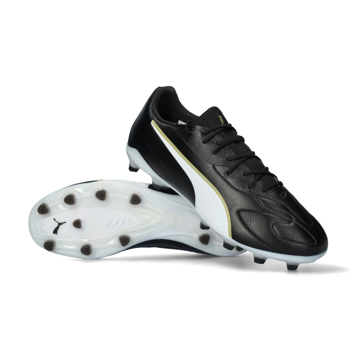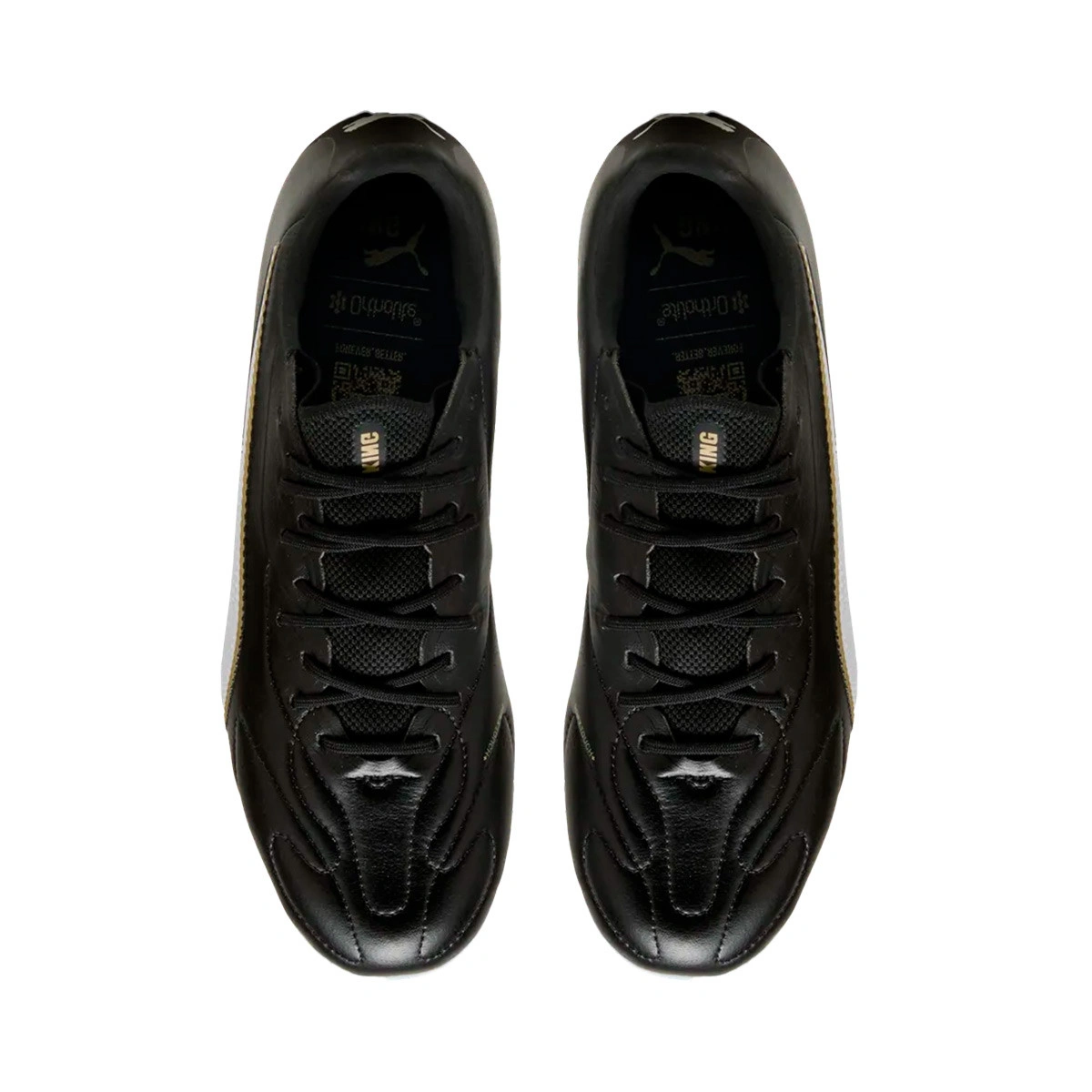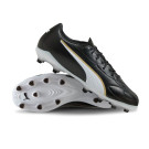 Scarpe da calcio Puma King 20 Match FG/AG, da usare su campi in erba naturale e artificiale. Di gamma base e disponibili nella colorazione Puma Black-Puma White-Puma Gold.