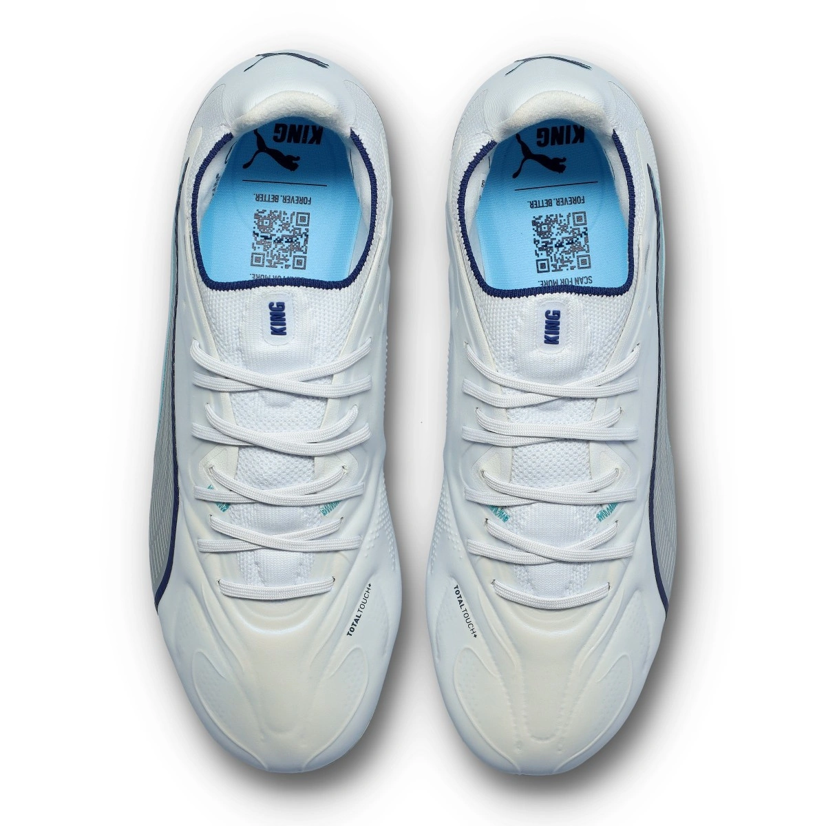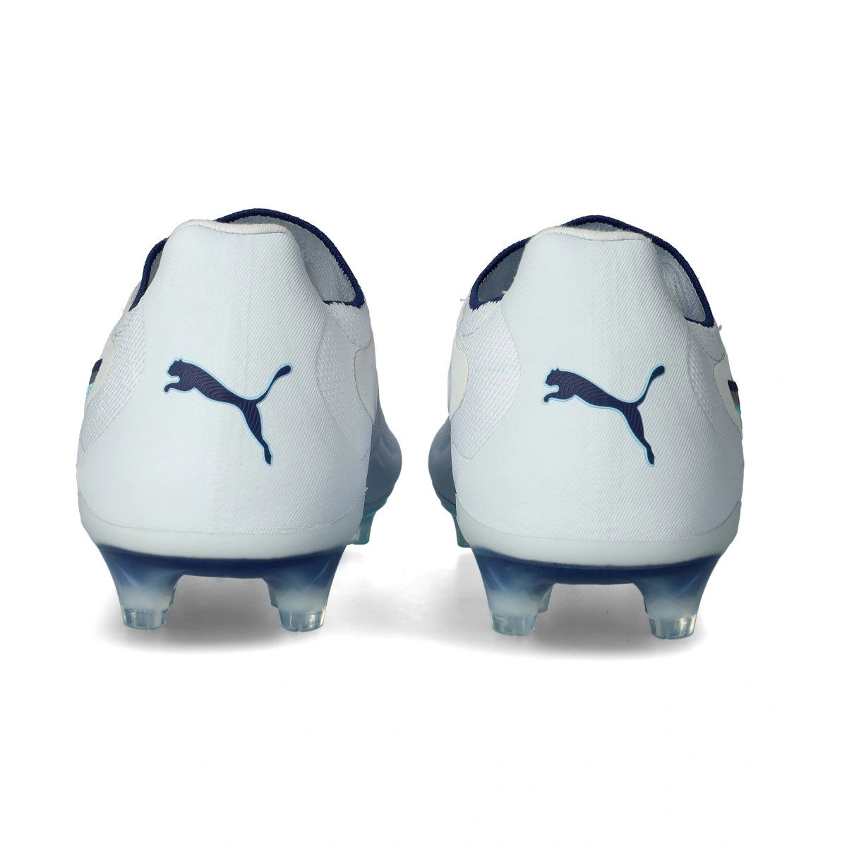 Scarpe da calcio Puma King 20 Ultimate FG/AG disponibili nella colorazione Puma Silver-Blue Jewel-Black. Per giocare su campi in erba naturale e artificiale.