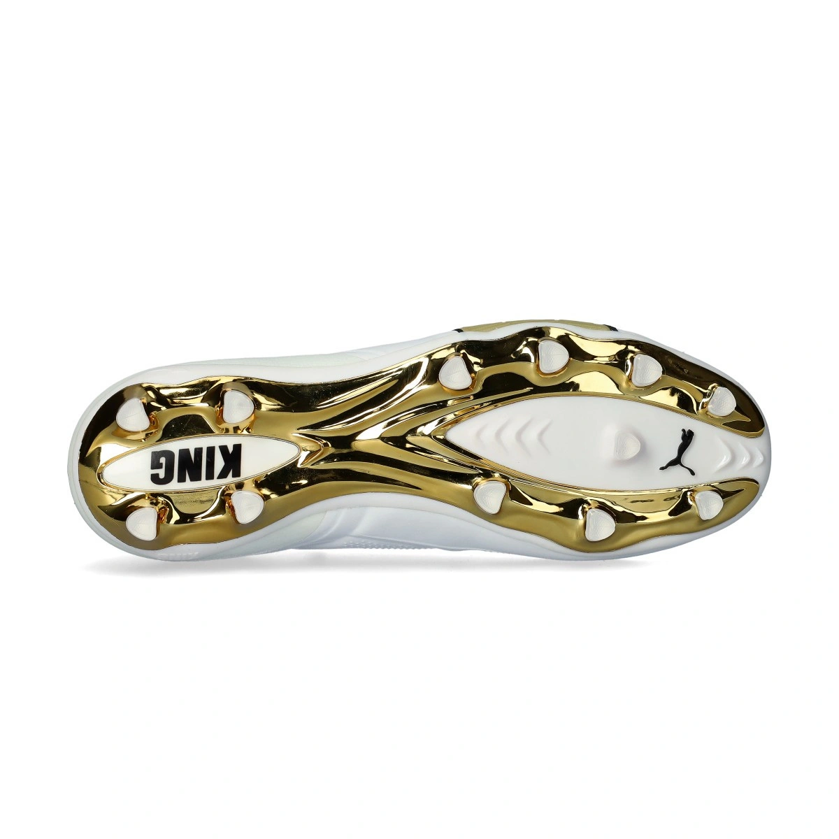 Scarpe da calcio Puma King 20 Ultimate FG/AG, disponibili nella colorazione White-Metallic Gold-Black. Scarpini adatti a giocare su campi in erba naturale e sintetica.