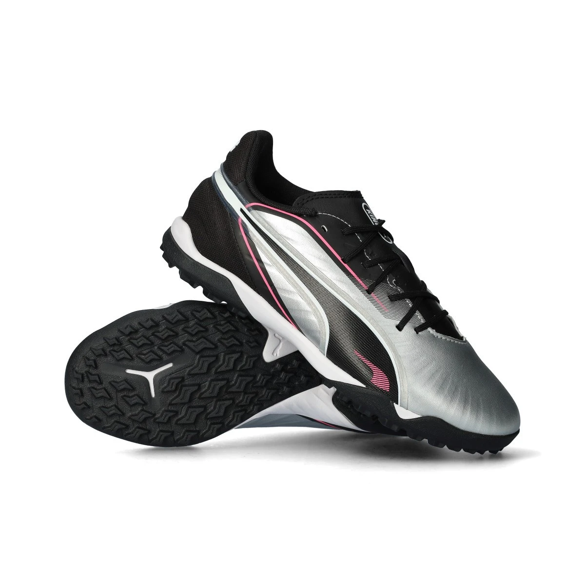Scarpe da calcio per bambini King Match Turf+Mid, disponibili nella colorazione Silver-Black-Sun Struck-White. Di gamma base adatte a campi in erba naturale e sintetica.