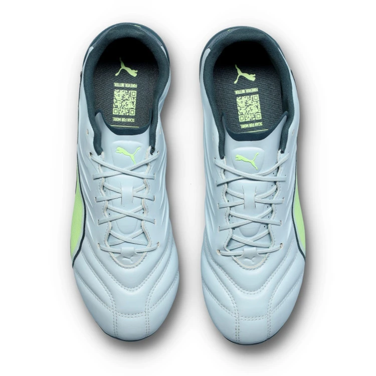 Scarpe da calcio per adulti Puma King Pro FG/AG. In pelle sintetica, da usare su campi in erba naturale e artificiale di ultima generazione. Di gamma media e disponibili nella colorazione Frosted Dew-Fizzy Apple-Gray Skies.