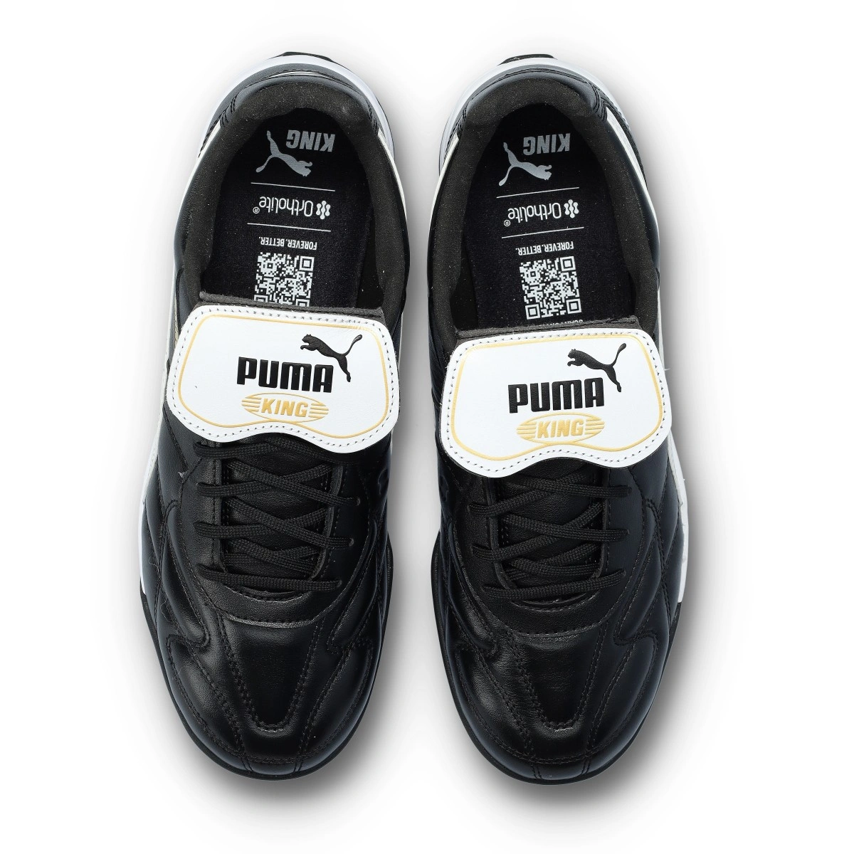 Scarpe da calcio Puma King Top Turf. Modello adatto a moquette o campi in erba sintetica, di colore bianco e nero.