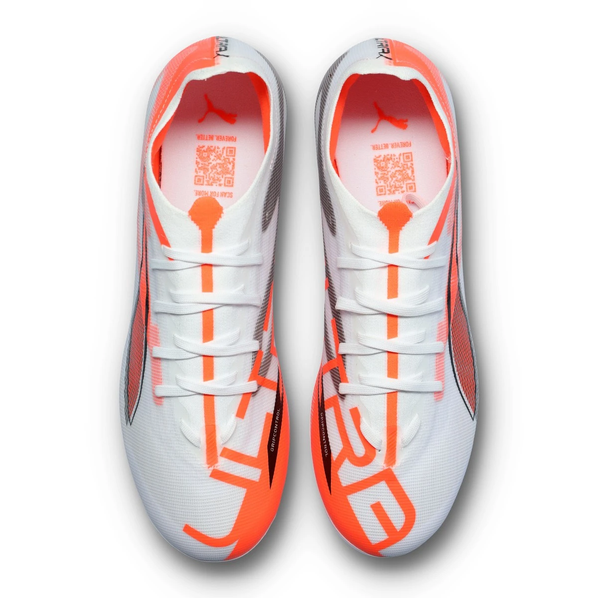 Scarpe da calcio per adulti Puma Ultra 5 Match MG. Sintetiche, da usare su campi in erba artificiale di prima generazione. Di bassa gamma e disponibili nella colorazione White-White-Glowing Red.