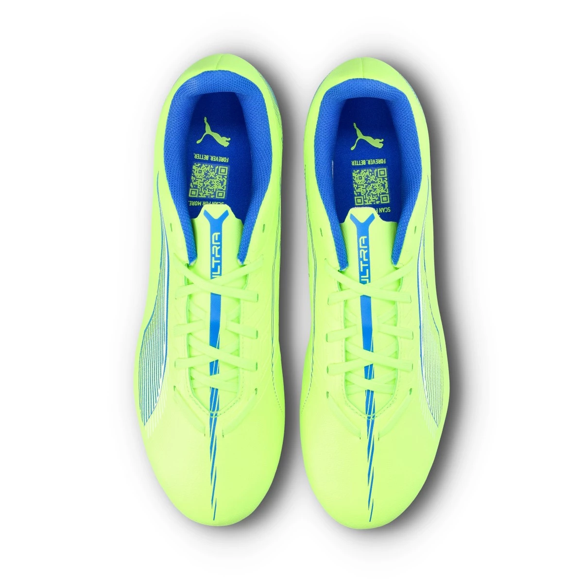 Scarpe da calcio per adulti Puma Ultra 5 Play FG/AG. Sintetiche, da usare su campi in erba artificiale e naturale. Di gamma bassa e disponibili nella colorazione Fizzy Apple-White-Bluemazing.