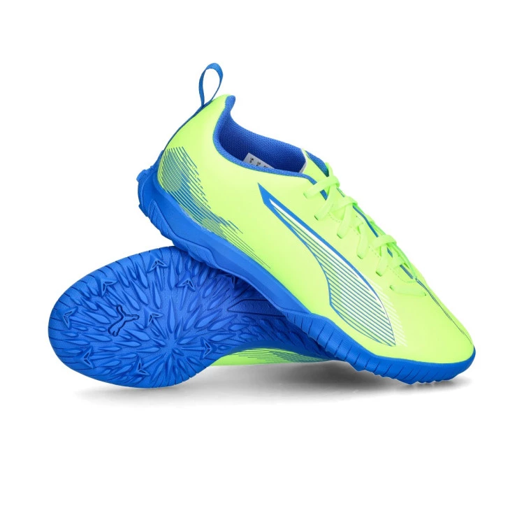 Scarpe da calcio per bambini Puma Ultra 5 Play Turf. Sintetiche da usare su campi in erba artificiale e moquette. Di gamma base e disponibili nella colorazione Fizzy Apple-White-Bluemazing.
