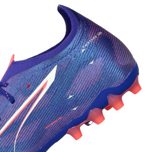 Scarpe da calcio per adulti Puma Ultra 5 Ultimate MG. In microfibra da usare su campi in erba sintetica di prima generazione. D'alta gamma e disponibili nella colorazione Lapis Lazuli-White-Sunset Glow.