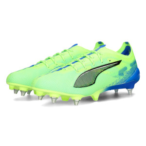 Scarpe da calcio per adulti Puma Ultra 5 Ultimate MxSG. In microfibra, da usare su campi in erba naturale umida. D'alta gamma e disponibili nella colorazione Fizzy Apple-White-Bluemazing.