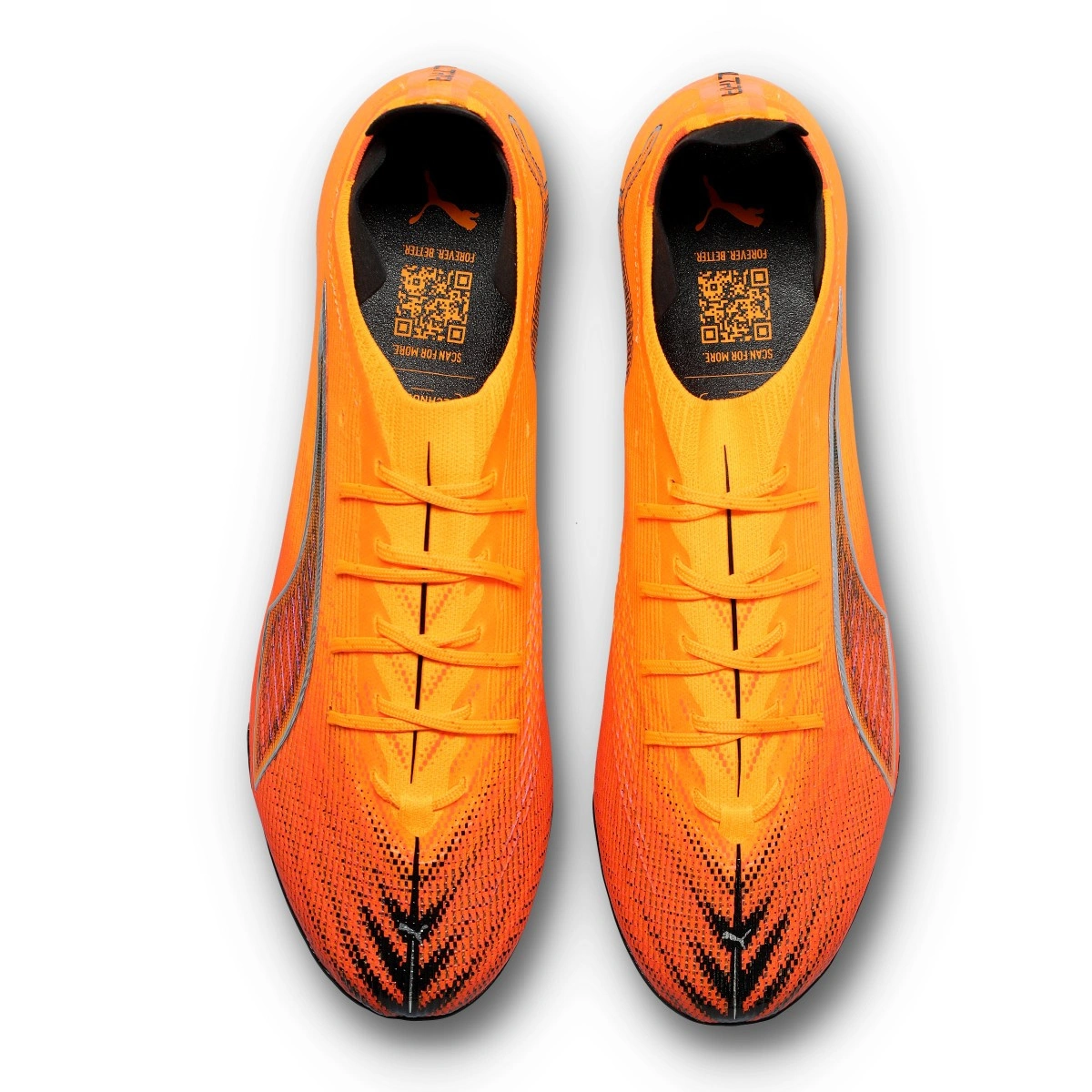 Scarpe da calcio Puma Ultra 6 Ultimate Carbon Brilliance FG In microfibra, da utilizzare su campi in erba naturale. Di alta gamma e disponibili nella colorazione Heat Fire-Black-Glowing Red.