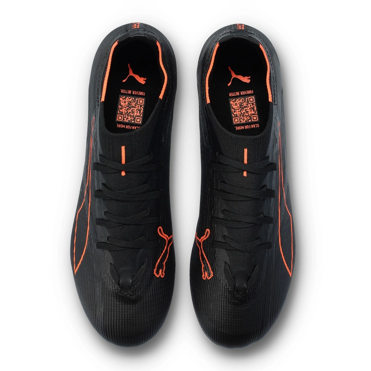 Scarpe da calcio Puma Ultra 6 Match FG/AG. Sintetiche, da usare su campi in erba artificiale e naturale. Di gamma base e disponibili nella colorazione Puma Black-Puma Red-Strong Gray.