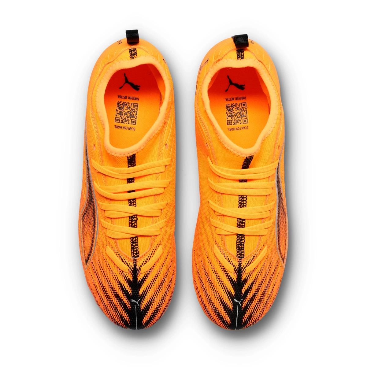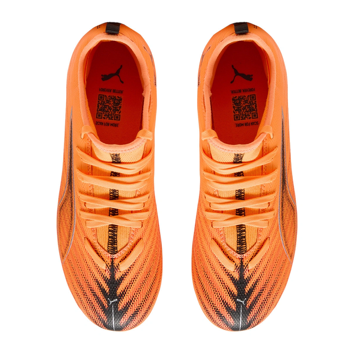 Scarpe da calcio Puma Ultra 6 Match MG per bambini. Sintetiche, per campi in erba sintetica di prima generazione. Di gamma bassa, disponibili nella colorazione Heat Fire-Black-Ravish.