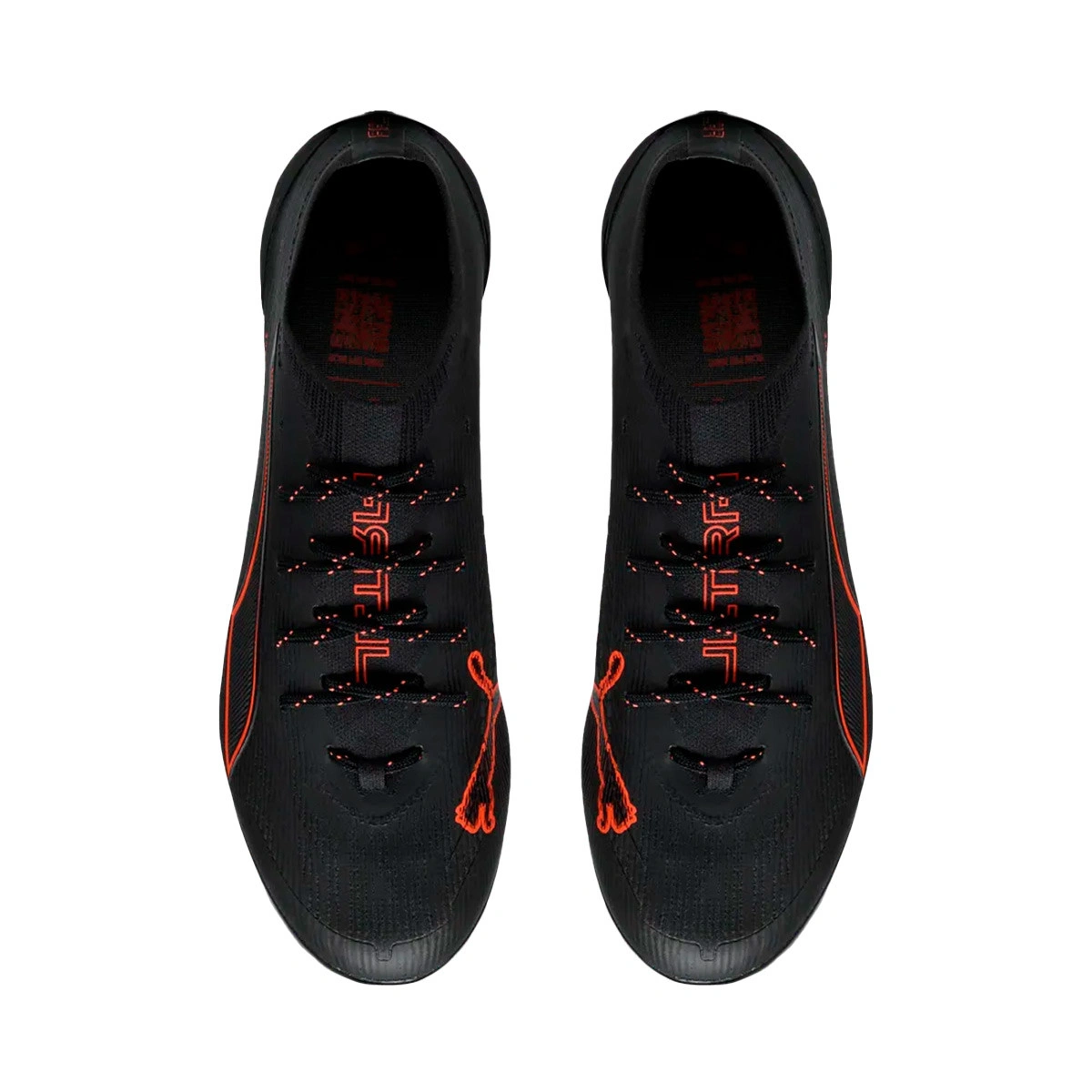 Scarpe da calcio Puma Ultra 6 Ultimate AG. In microfibra, da utilizzare su campi in erba sintetica. Di alta gamma e disponibili nella colorazione Puma Black-Glowing Red-Strong Gray.