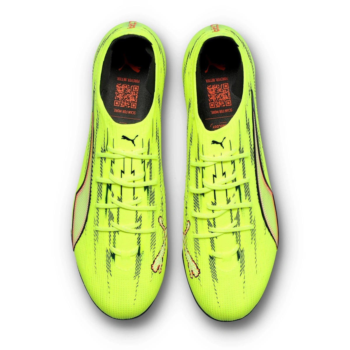 Scarpe da calcio Puma Ultra 6 Ultimate Carbon Brilliance FG. In microfibra, da usare su campi in erba naturale. D'alta gamma e disponibili nella colorazione Yellow Alert-Black-Silver-Glowing.
