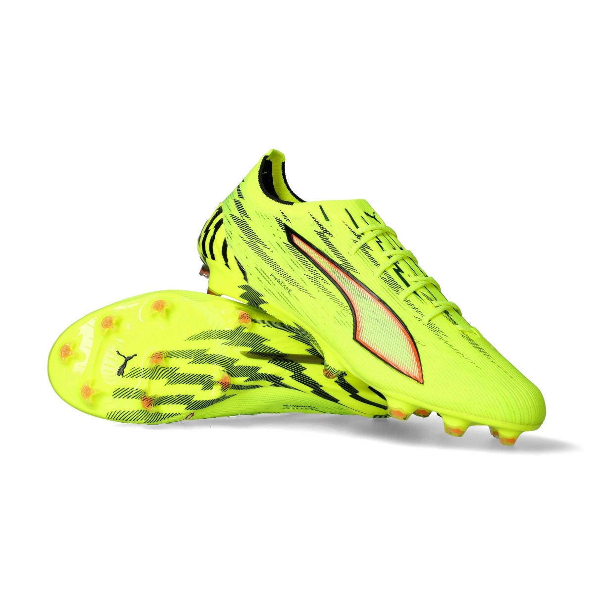 Scarpe da calcio Puma Ultra 6 Ultimate FG. In microfibra, da usare su campi in erba naturale. Di gamma alta e disponibili nella colorazione Yellow Alert-Black-Silver-Glowing.