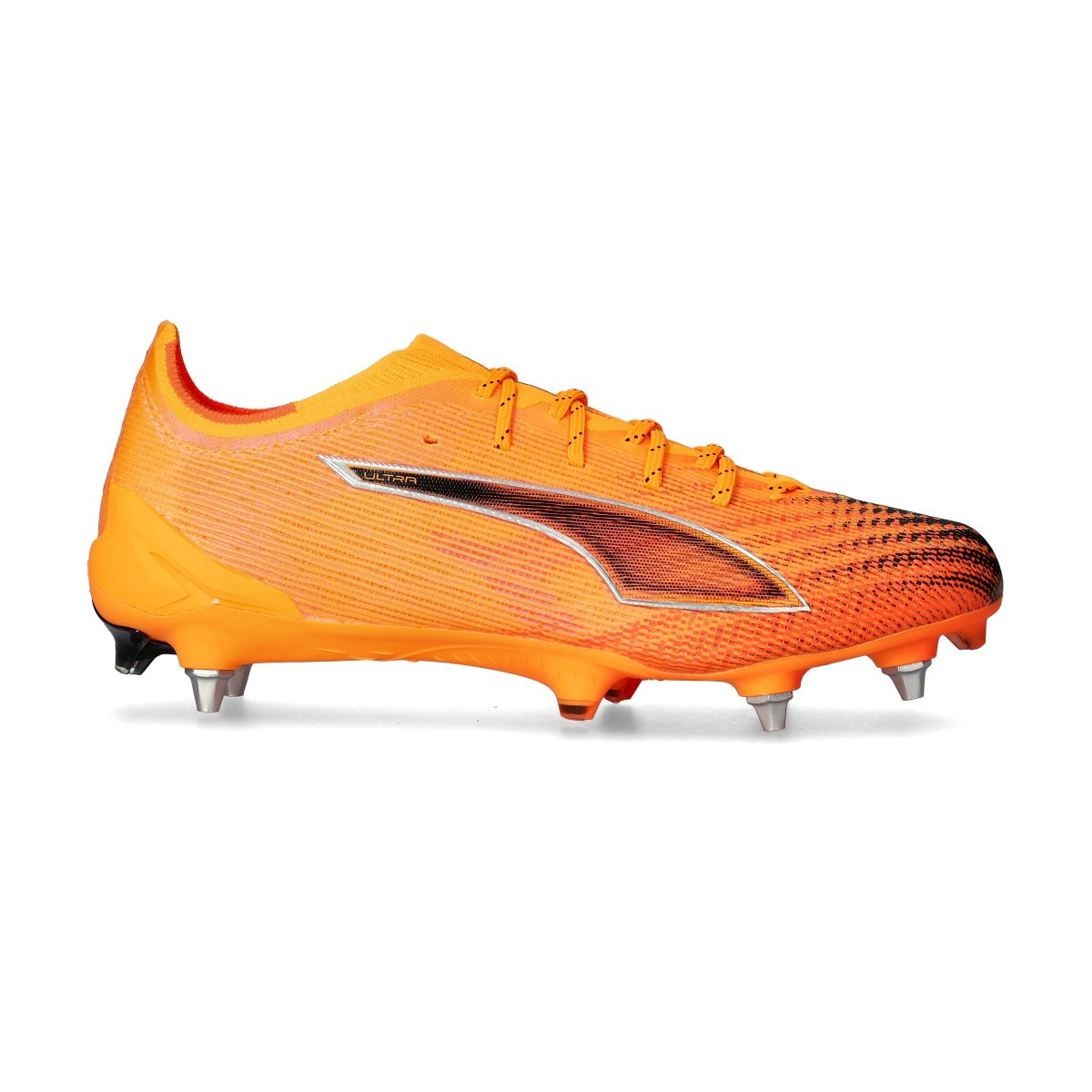 Scarpe da calcio Puma Ultra 6 Ultimate MxSG. In microfibra, da usare su campi in erba naturale umida o fangosa. Di gamma alta e disponibili nella colorazione Heat Fire-Black-Glowing Red.