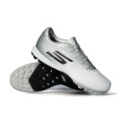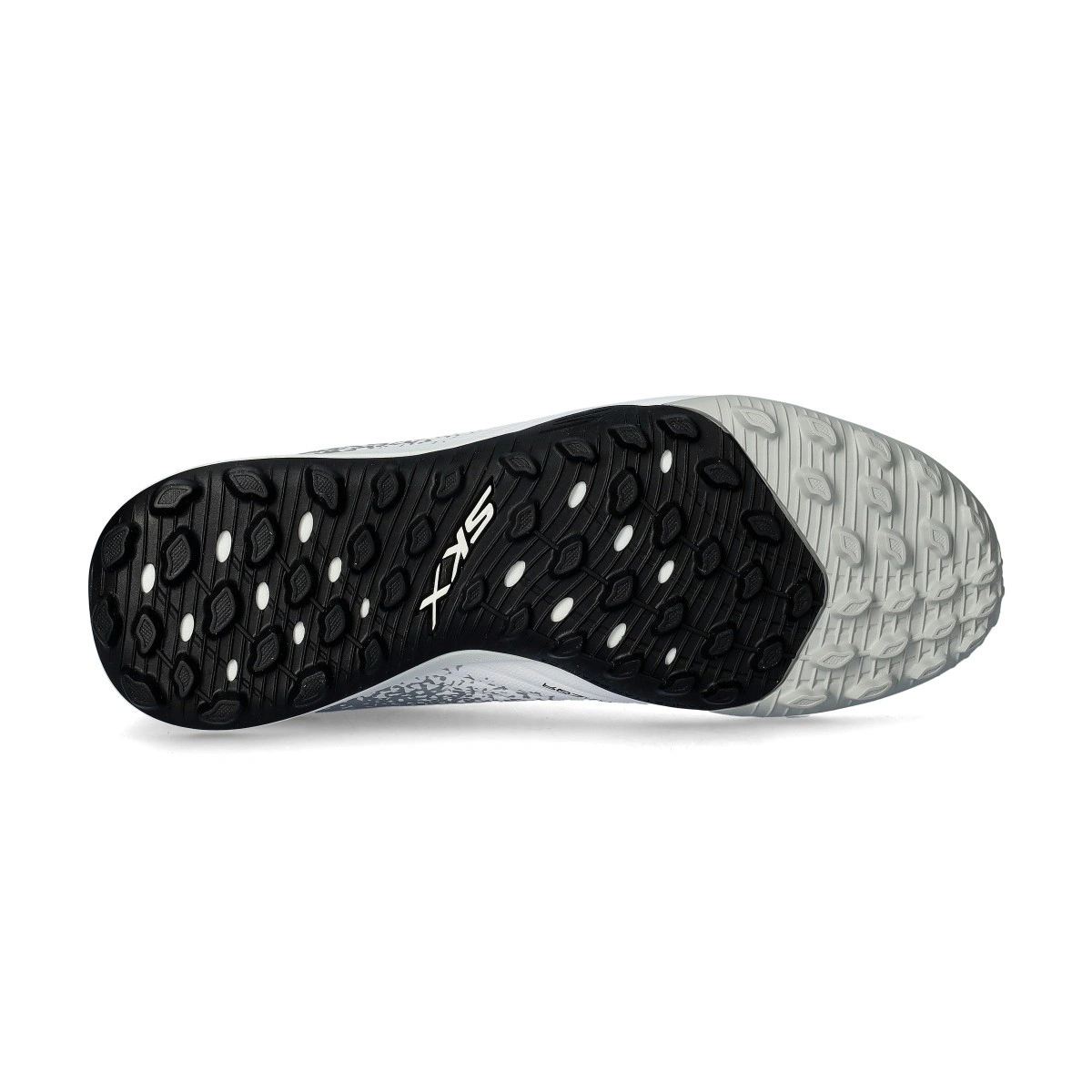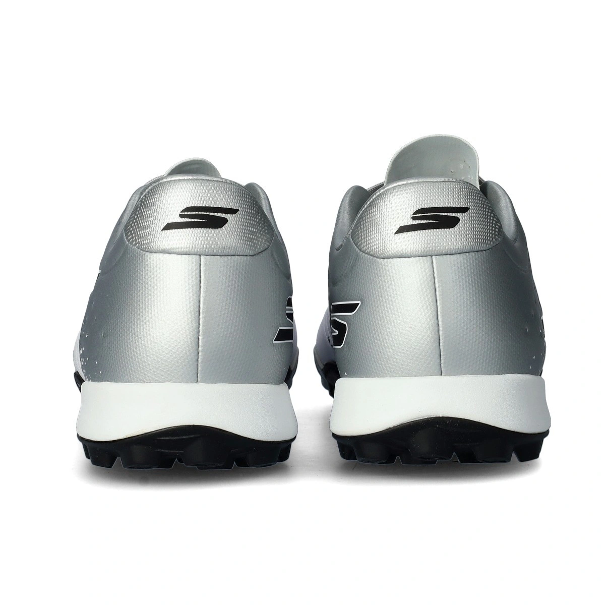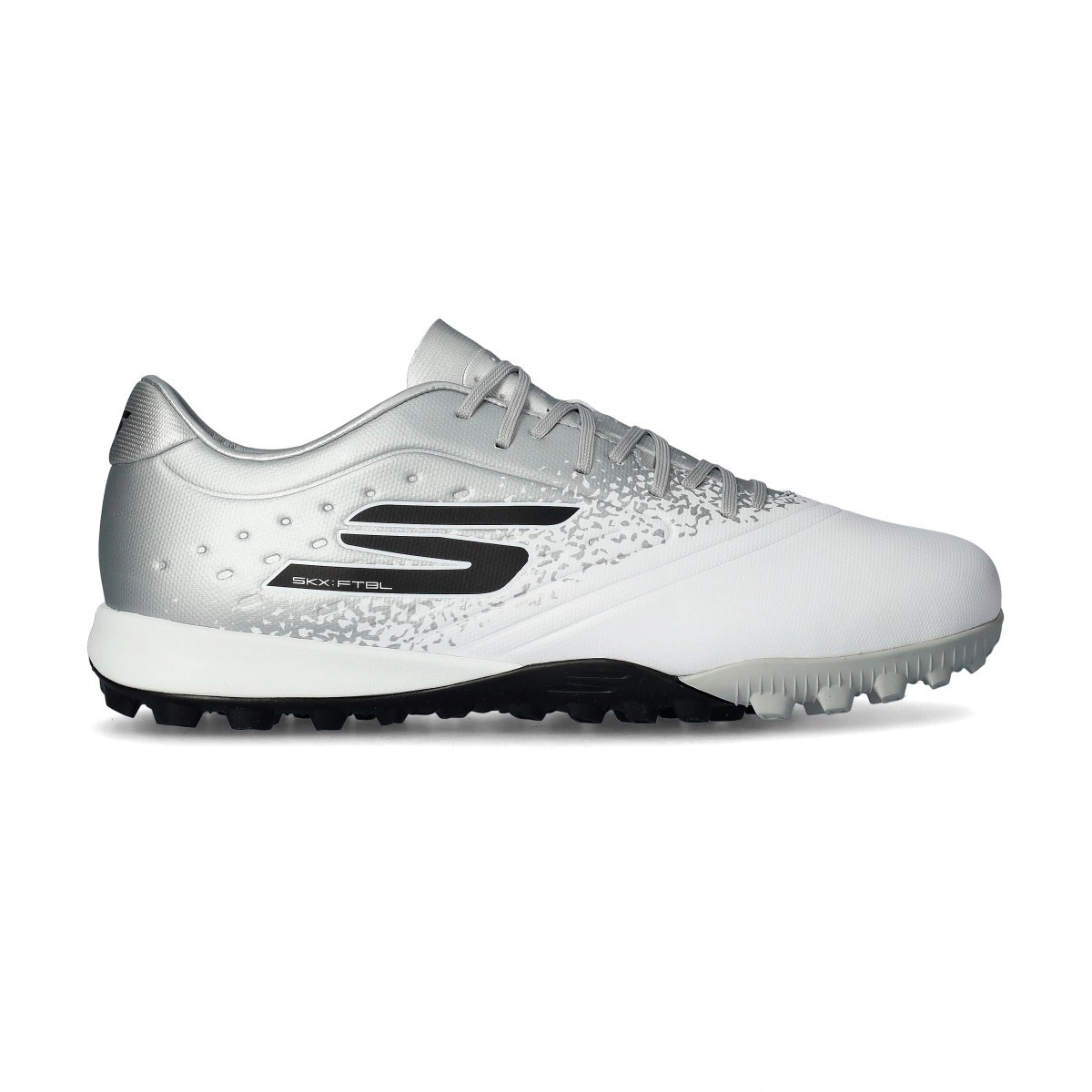 Scarpe da calcio Razor 1.5 Academy Turf della marca Skechers, di colore argento e bianco, per moquette o campi in erba sintetica.