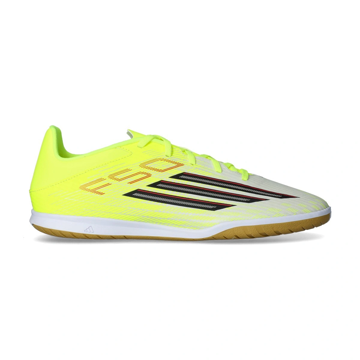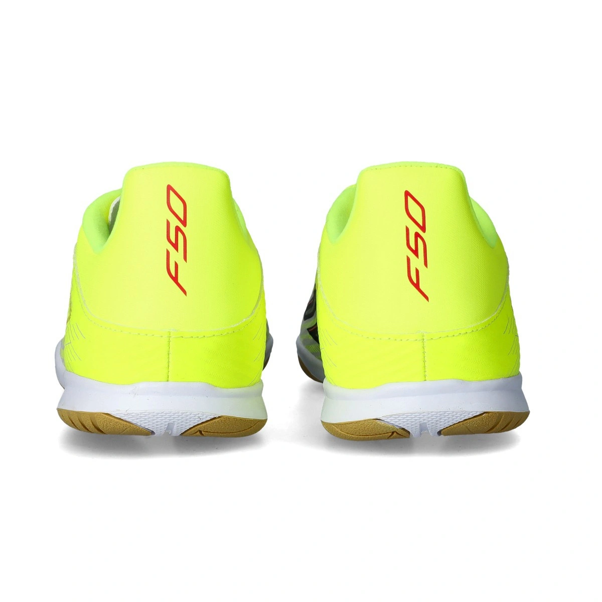 Scarpe da calcio F50 League IN della marca adidas e disponibili nella colorazione Team Solar Yellow-Core Black-Lucid Red. Di gamma base e adatte a terreni indoor.