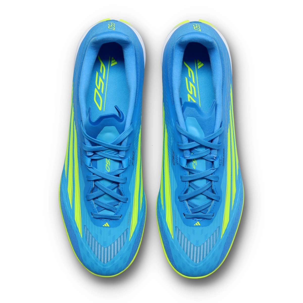 Scarpe da calcio F50 League IN della marca adidas e disponibili nella colorazione Lucid Ray Blue-Team Solar Yellow -Lucid Aqua.
