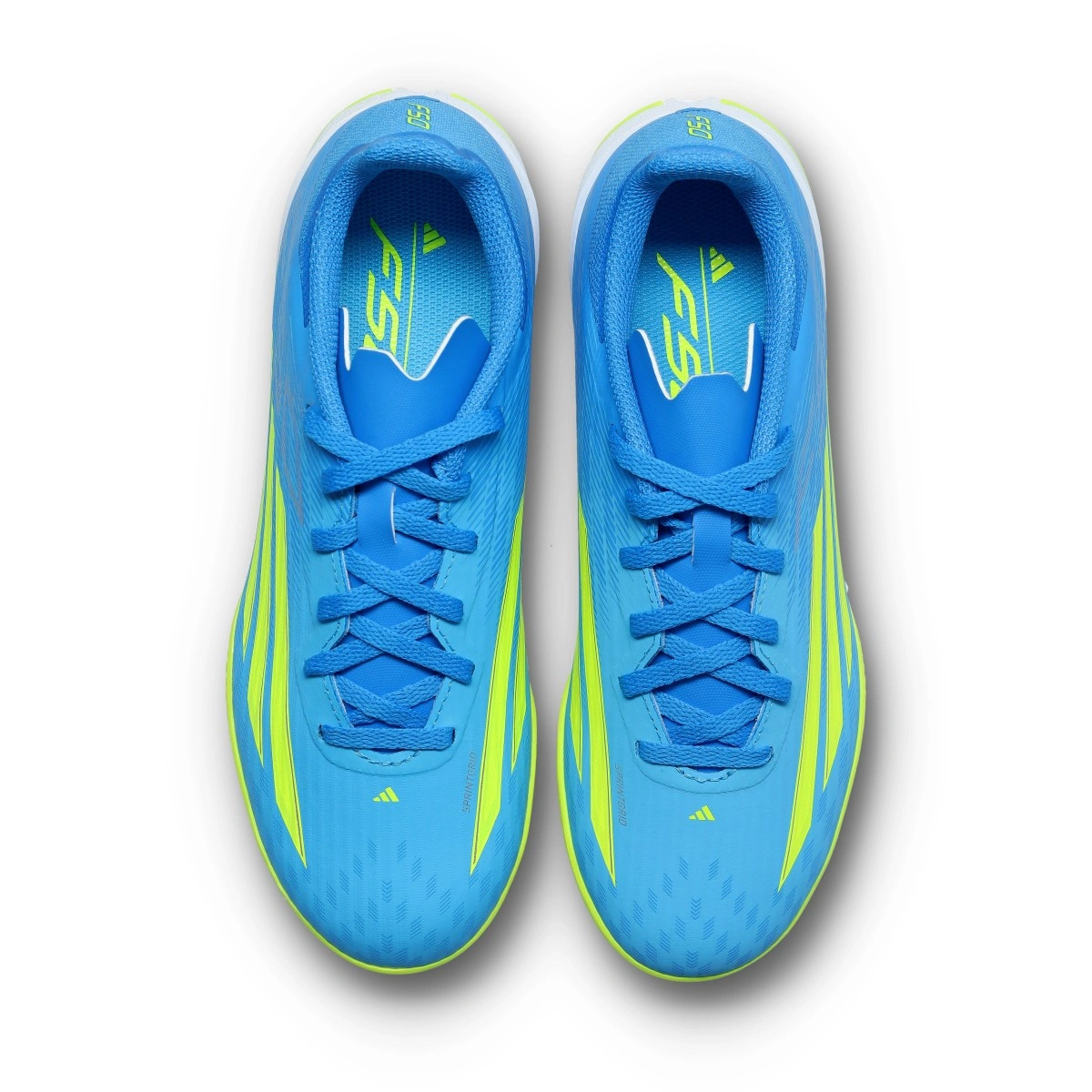 Scarpe da calcio F50 League IN del marchio adidas disponibili nella colorazione Lucid Ray Blue-Team Solar Yellow - Lucid Aqua. Modello per bambini.