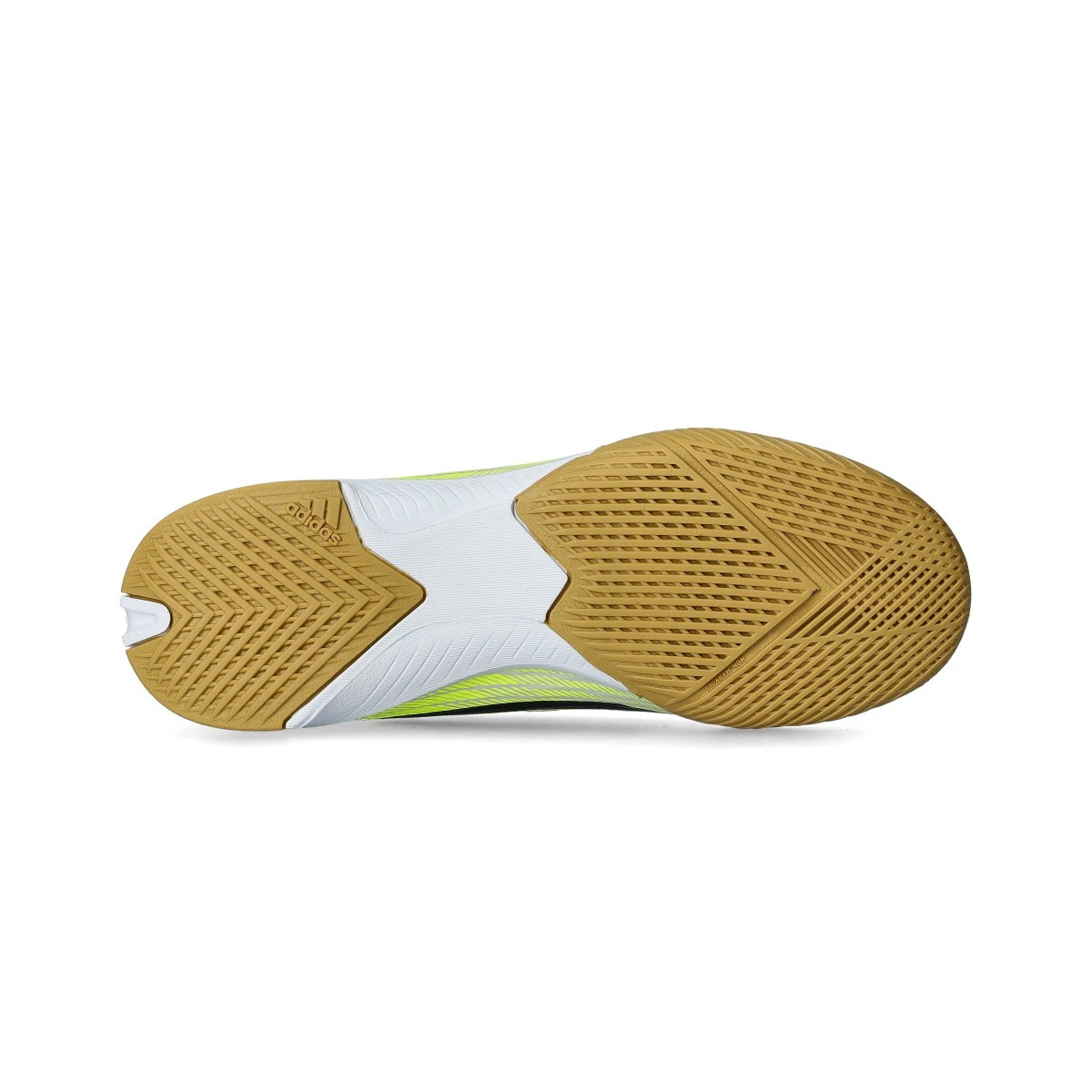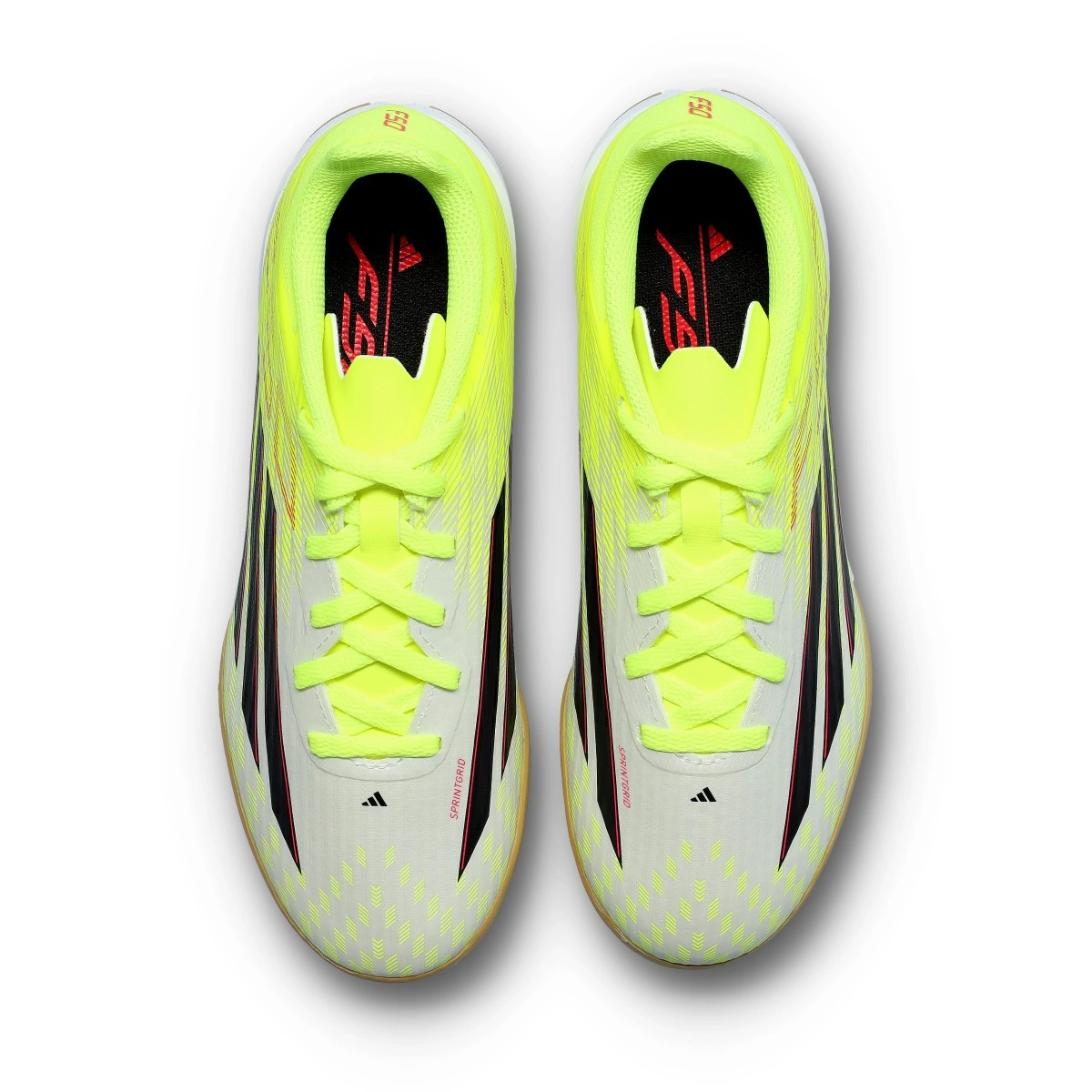 Scarpe da calcio F50 League IN per bambini della marca adidas e disponibili nella colorazione Team Solar Yellow-Core Black-Lucid Red.