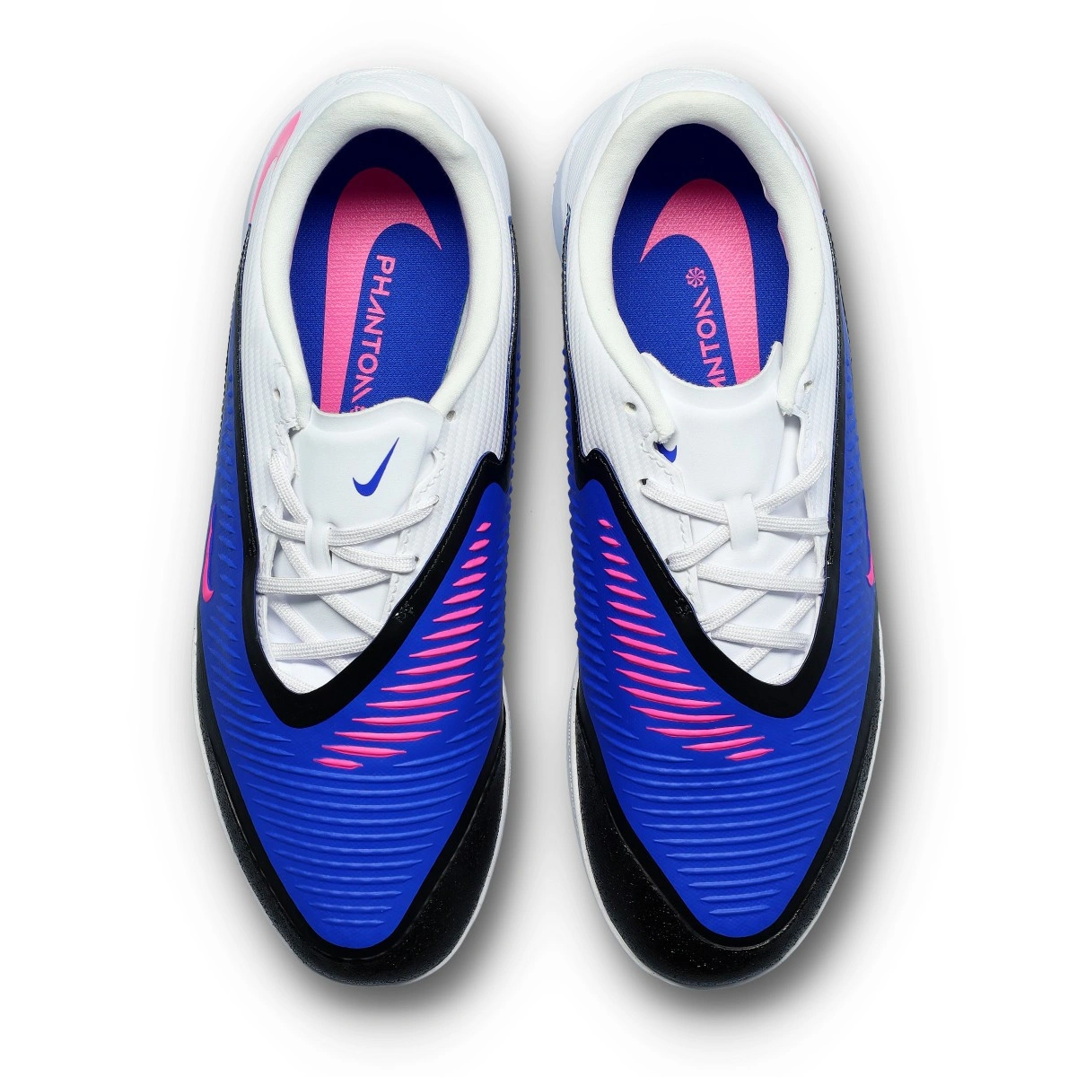 Scarpe da Futsal Nike Phantom 6 Low Academy IC. Da calcetto e in filato, senza calzino, da usare su cemento, parquet o moquette. Di gamma media e disponibili nella colorazione Racer Blue-White, per giocatori che puntano su controllo e precisione.
