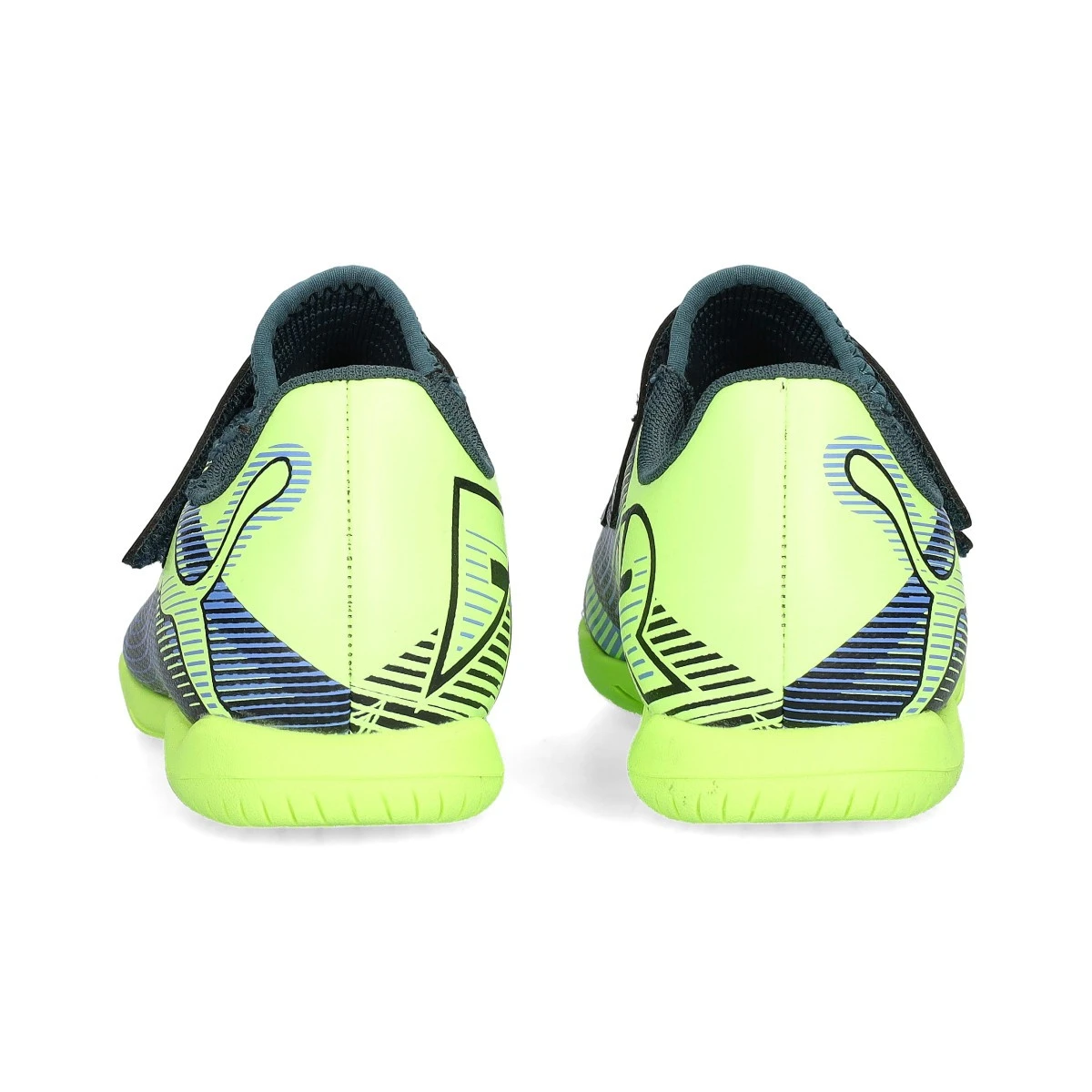 Scarpe da calcio a cinque per bambini con chiusura a strappo Puma Future 7 Play IT. Sintetiche, da usare su campi di calcio indoor. D'alta gamma e disponibili nella colorazione Gray Skies-Elektro Purple-Fizzy Apple-White.