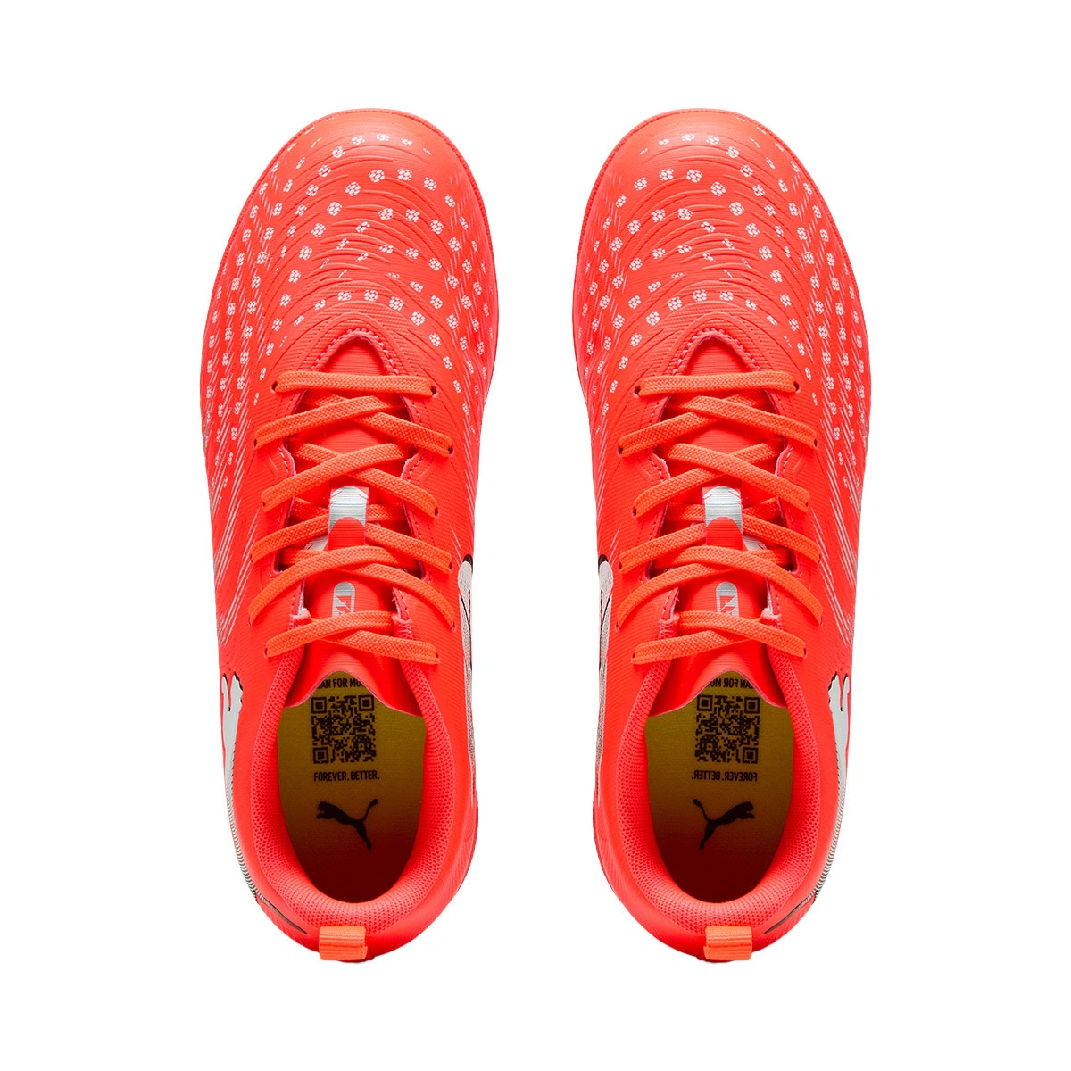 Scarpe da calcetto per bambini Puma Future 9 Match Play con lacci. Sintetiche, da usare sui campi di calcio indoor. Di gamma alta e disponibili nella colorazione Puma Red-Puma White-Glowing Red-Puma Black.