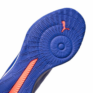 Scarpe da calcio a cinque per bambini Puma Ultra Match IT + Mid. Sintetiche senza lacci da usare su campi in cemento e parquet. Di gamma bassa e disponibili nella colorazione Lapis Lazuli-White-Sunset Glow.