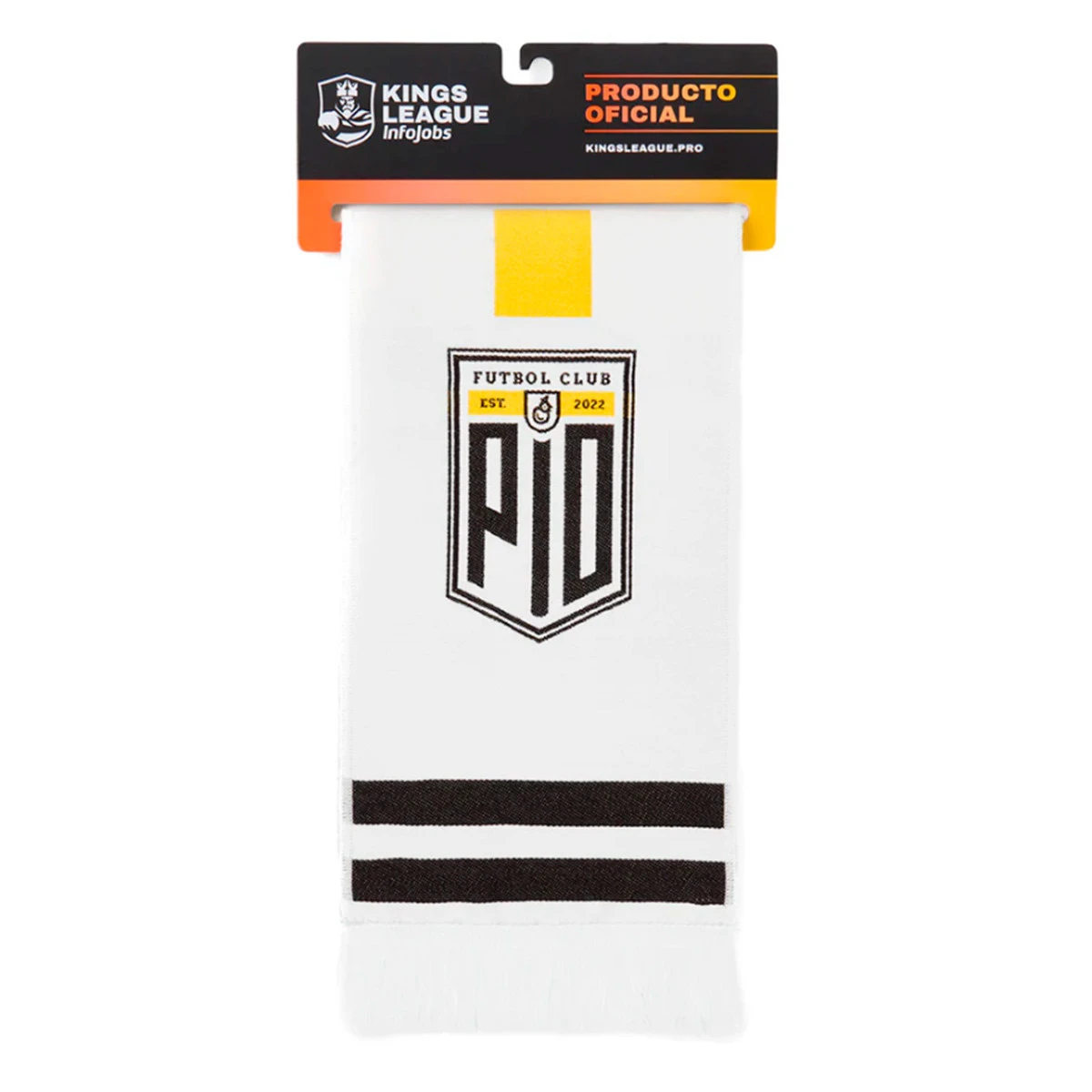 Sciarpa a maglia doppia della Kings League Pio FC con frange decorative abbinate. Colore: bianco, nero e giallo.
